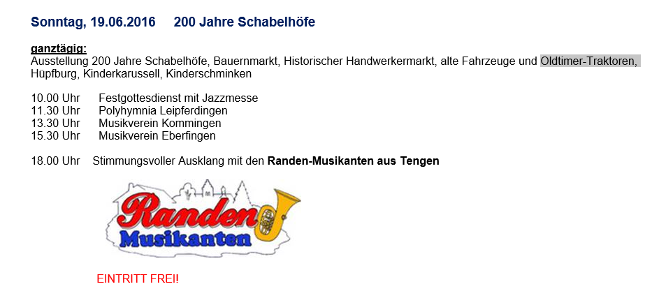 Also lasst Euch dieses Event nicht entgehen und feiert mit uns 200 Jahre Schabelhöfe Riedöschingen.