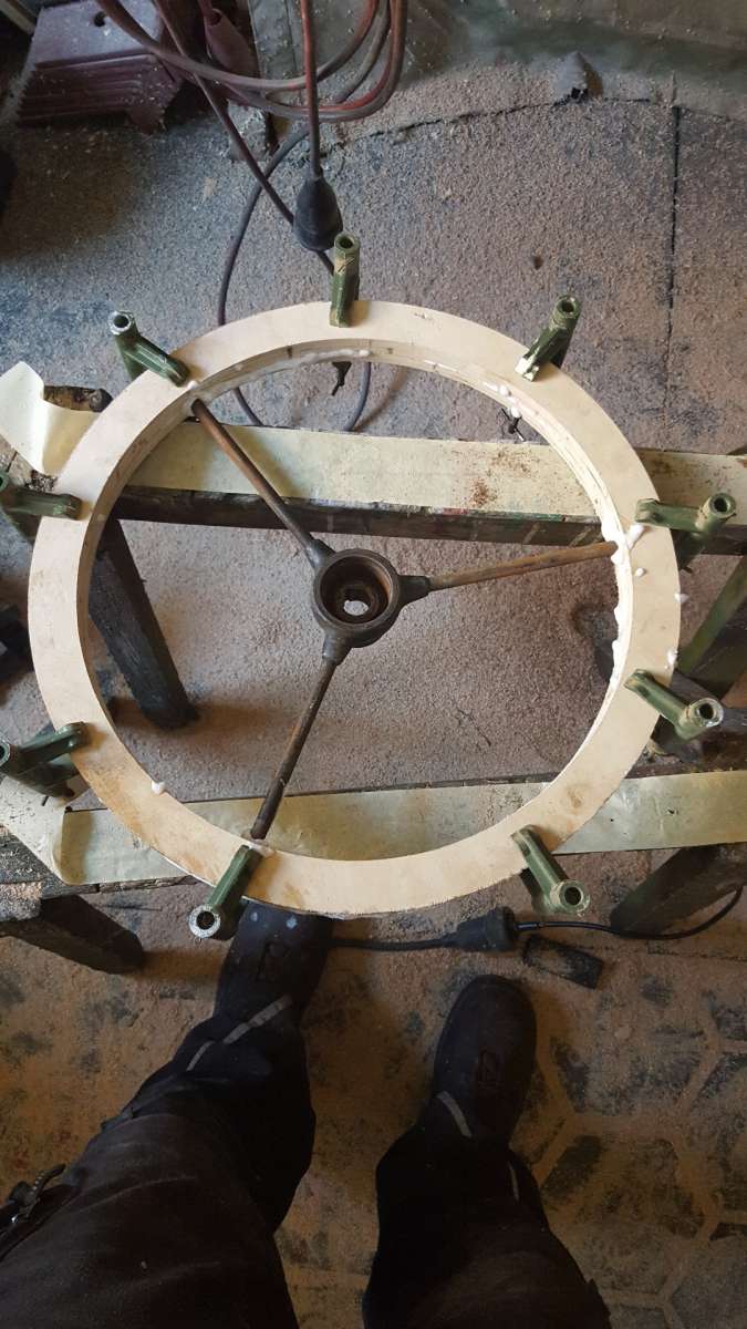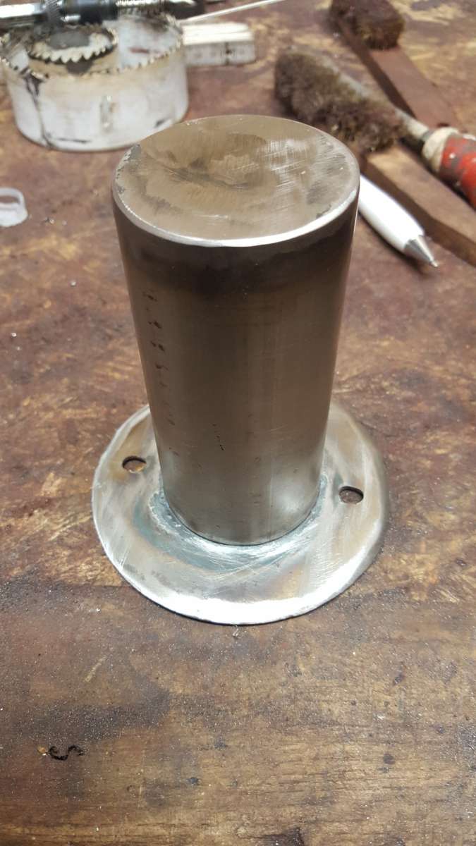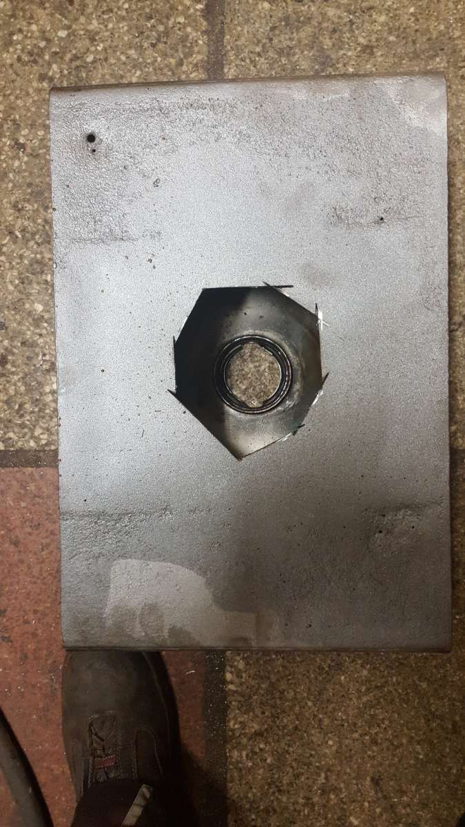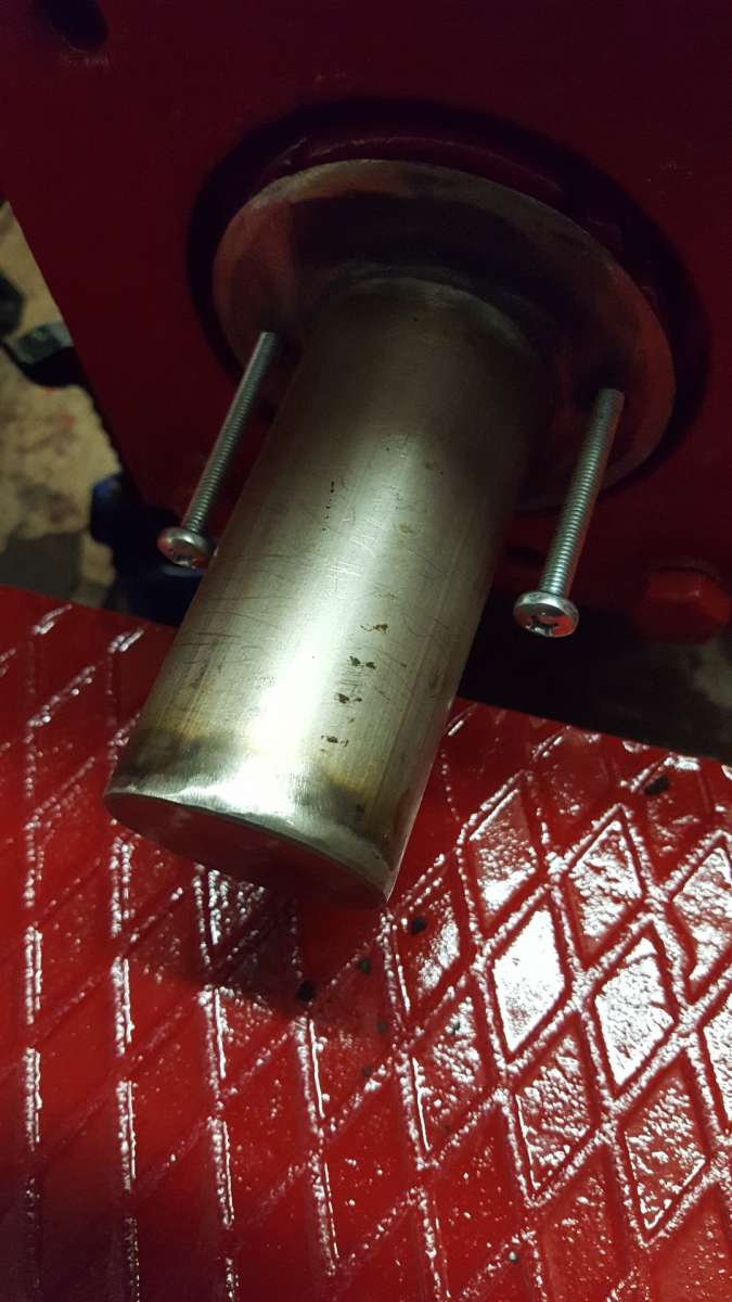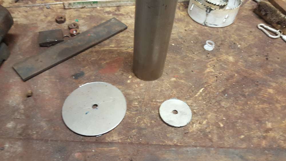 Natürlich auch die große Scheibe noch so aufgebort dass das Rohr durchpasst. Und die Sache verschweißt.