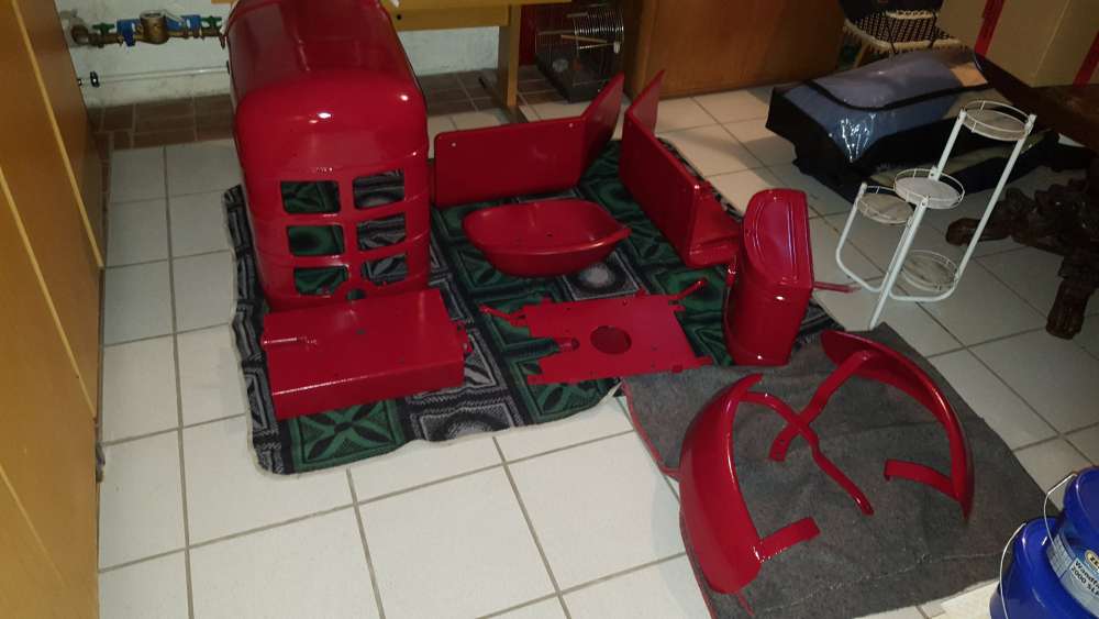 Die gestrahlten Teile wurden nach dem Richten wieder zum Lackierer gebracht. Sogar schon fertig. Habe aufgrund der sehr starken Rostnarben auf das Verspachteln bzw. Verzinnen verzichtet. Gibt dem Ganzen einen eigenen Charakter.