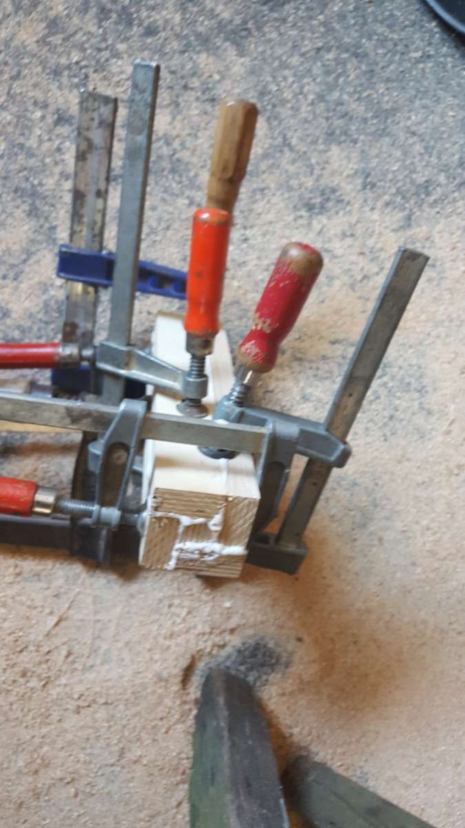 Also die Reste entfernen. Scheiben für das Lenkrad fräsen und einen Rohling für den Schaltknauf verleimen.