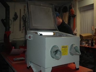 es handelt sich um eine Sandstrahlbox wie man sie in Ebay kaufen kann. Sie funkioniert prima, allerdings braucht man einen schweren Kompressor der ca. 350 bis 400L/min bringt.