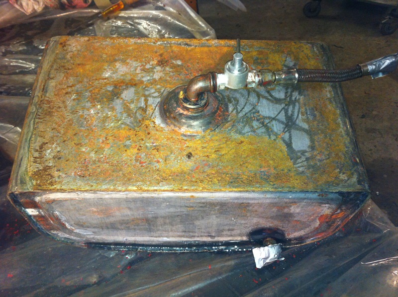 In dieser Woche habe ich mir unter anderem den Tank vorgeknöpft. Auf das Sandstrahlen verzichtete ich lieber aufgrund des dünnen Bleches und habe statt dessen die alte Farbe mit Hilfe eines Lack-Lösemittels entfernt. So weit so gut. Der Tankboden aber war zum Teil von tief eingewirktem Rostbefall an der Außenseite betroffen. So konnte ich an mehreren Stellen mit einer dünnen Nadel durchstoßen. Lange wäre das wohl nicht mehr gut gegangen.