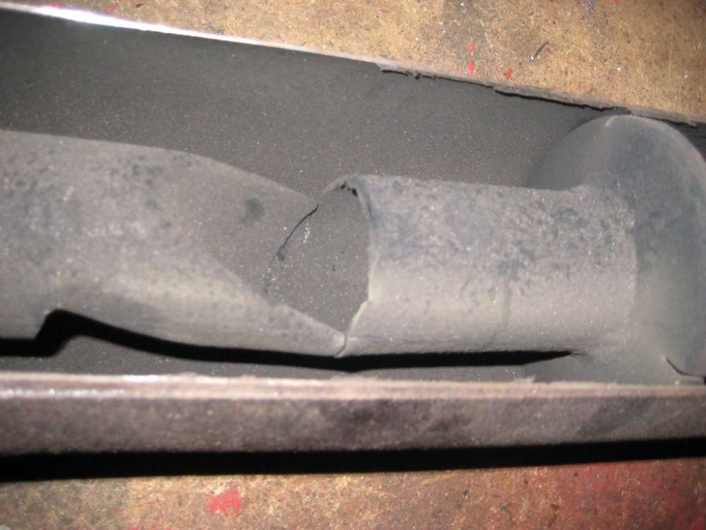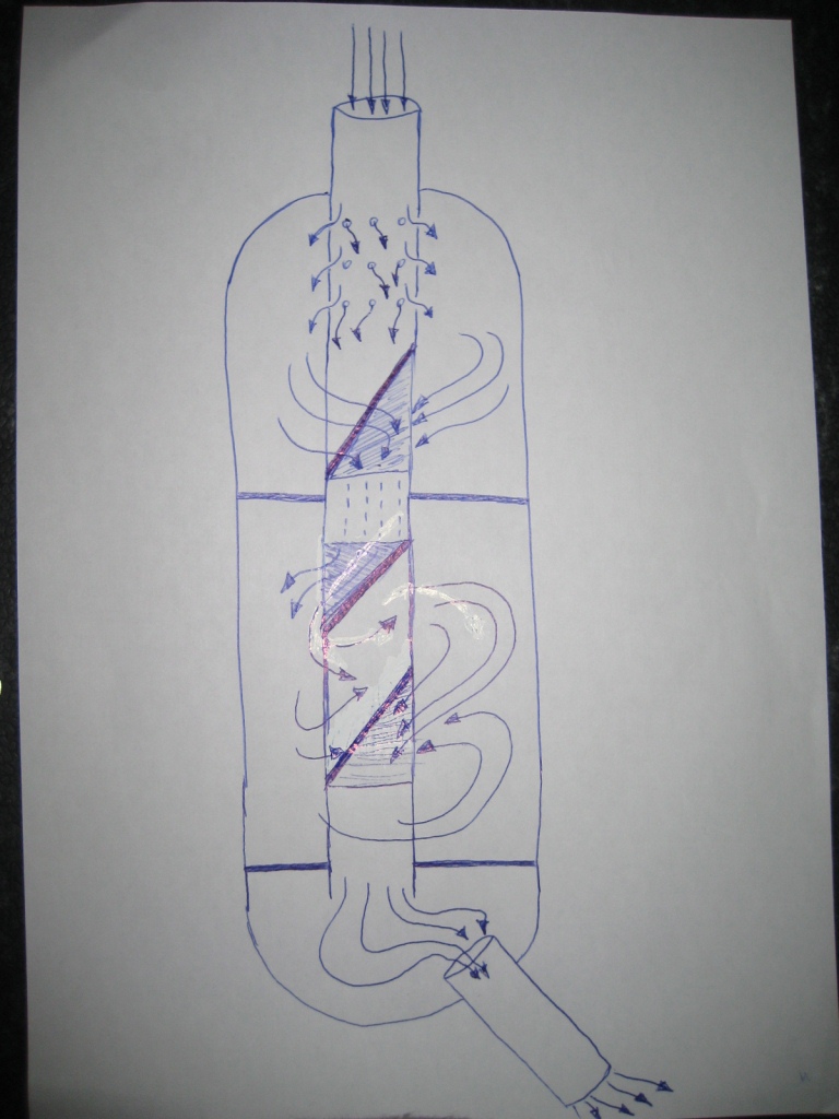 Oben, innerhalb des Zylinders dringt das Gas durch die kleinen Löcher und verwirbelt in der oberen, ersten Kammer, die von der Zweiten durch eine Scheibe abgetrennt ist. Noch innerhalb der ersten Kammer ist etwas tiefer das Innenrohr bis zur Hälfte eingesägt und einseitig nach innen gebogen, so dass der Durchgang zurück versperrt ist. Siehe folgendes Bild.
