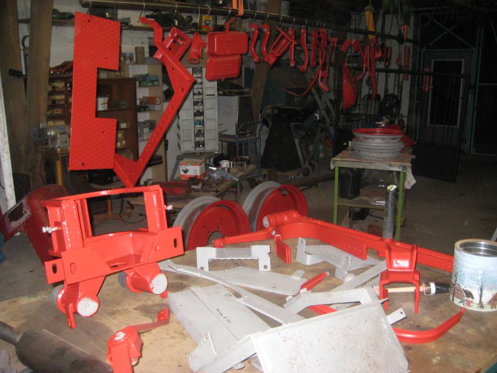 Dank der milden Temperaturen stecke ich in meiner Werkstatt mitten in der Restauration. Nach dem Zerlegen ließ ich die Einzelteile sorgfältig mit feinem Sand abstrahlen. Empfindliche Stellen, wie Öffnungen oder Wellen habe ich mit Blechscheiben oder dickem Klebeband geschützt (Foto). Motor und Getriebeblock sowie die Motorhaube wurden natürlich nicht gestrahlt. Jetzt der Grundlack. So wie bereits im Forum gelesen, benutze ich "Drei in Eins Lack, Brantho Korrux". Der ist zwar geringfügig teurer aber echt gut. Lässt sich auch bei Minustemperaturen noch ohne Läufer anwenden und verbindet sich perfekt. Er eignet sich zwar prinzipiell als Endlack, wird aber nur in seidenglänzend angeboten. Also werde ich die Teile zwei mal damit vorstreichen und anschließend mit einem Kunstharz-Lack spritzen. ...