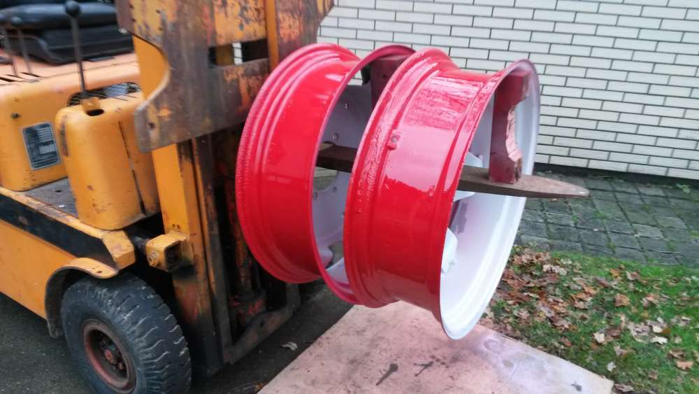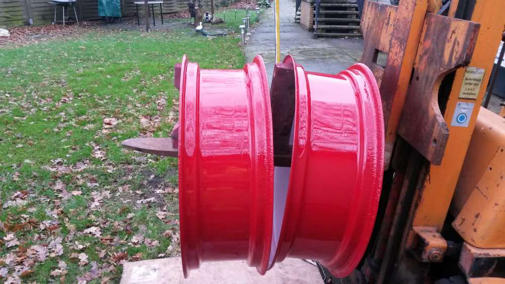 heute hatte ich ein wening Zeit und habe die Hinterachsfelgen bzw. von den Felgen das Felgenmaul lackiert. Wenn ich die neuen Reifen aufgezogen habe werde ich sie zuende lackieren um ggf. Beschädigungen im Lack bei der Montage zu vermeiden.