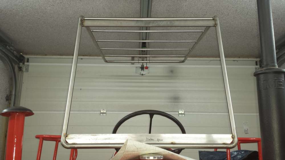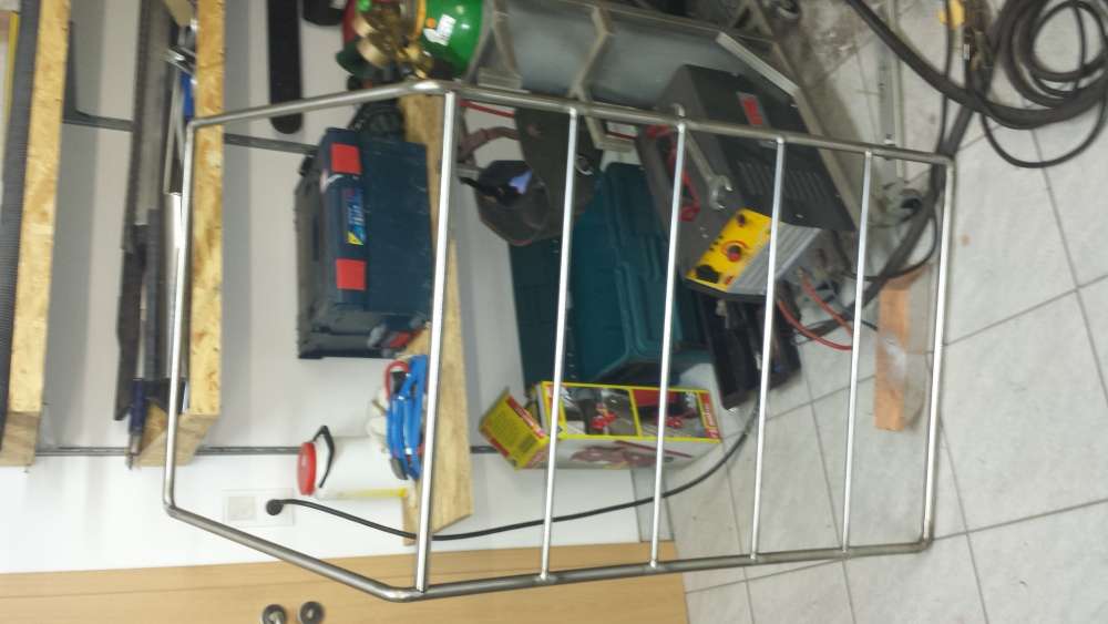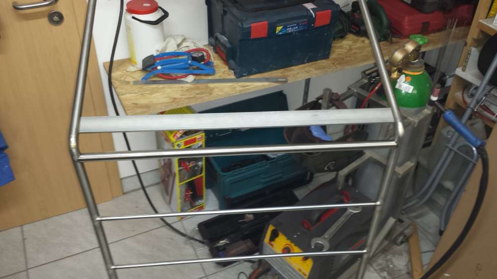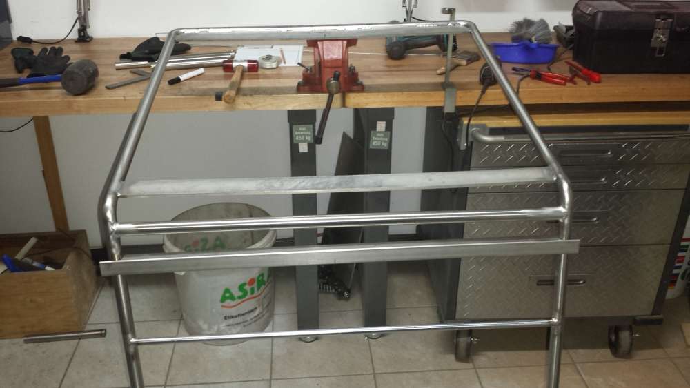 In der Werkstatt ging es am eigentlichem Verdeck weiter. Inzwischen sind alle Schweißnähte gesetzt und gesäubert. Das Vierkantrohr, welches links und rechts übersteht, ist lediglich ein Abstandshalter, den ich zum Schweißen des Rahmens nutze, um den Verzug in Grenzen zu halten und um den Abstand zu halten, damit ich nicht immer nachmessen mußte.