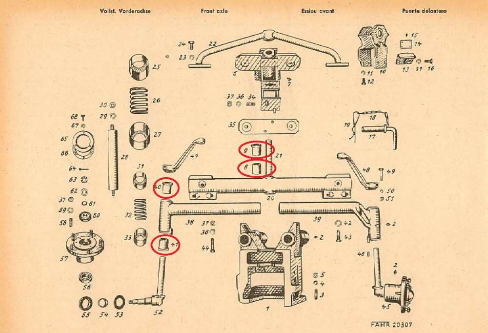 Ich bin auf der Suche nach technischen Zeichnungen der im Bild eingekreisten Teile. Es handelt sich um die Lagerbüchsen der Vorderachse für Vorderachstragbolzen und Achsfaust. Kann mir da vielleicht jemand helfen?