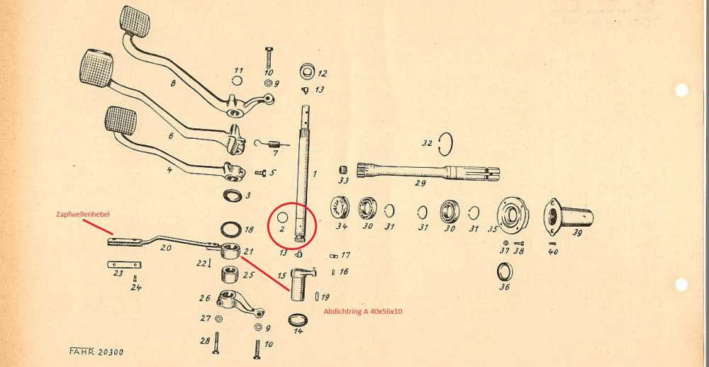 Beim D130 ist die Abdichtung wie folgt gelöst. Ist zwar von einem D130, sollte bei dir jedoch ähnlich sein. Auch ich hatte ein Leck am Zapfwellenhebel, aber die Ursache war der O-Ring, der die Welle zum Gehäuse abdichtet. Bei mir 25x2. Dazu muß jedoch die komplette Welle raus.