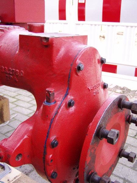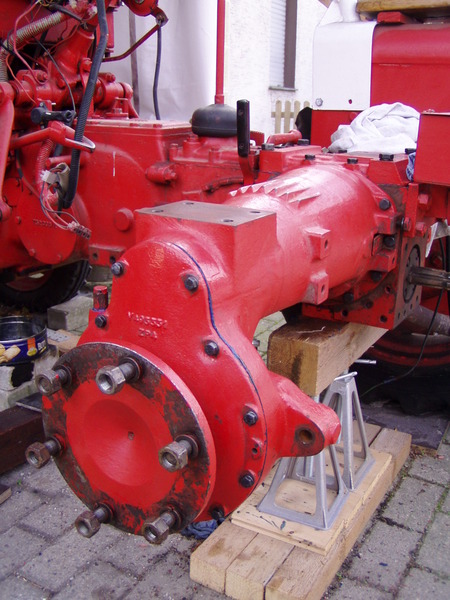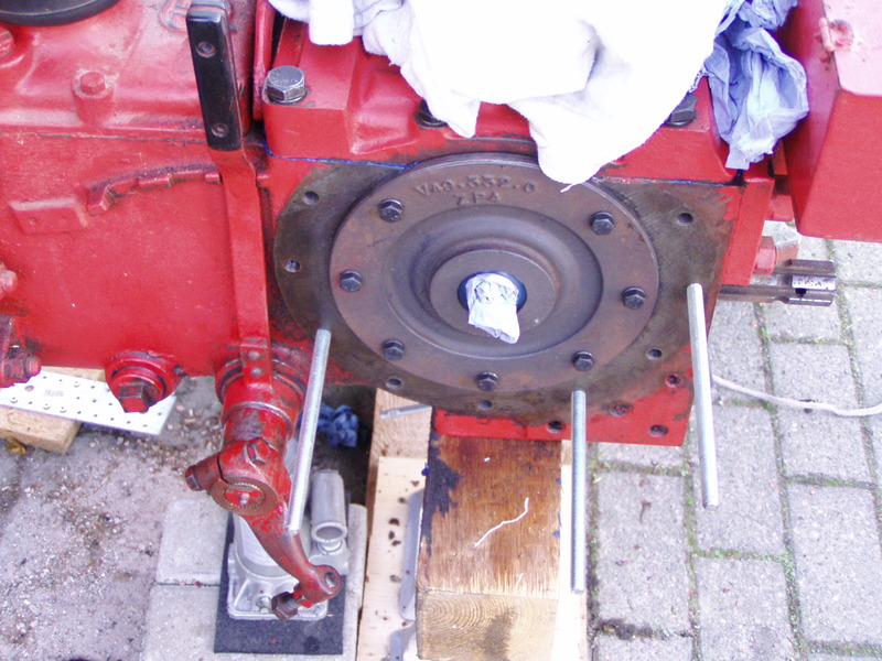 Der Seitendeckel vom Getriebe ist auch schon darauf (man beachte die Gewindestangen zur Vorzentrierung):