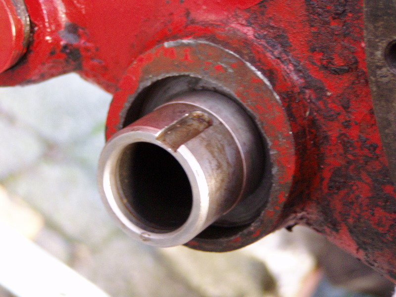Wellenschutzhülse auf der Welle der Schaltung für die Zapfwelle. Das Schieben der Hülse war nicht ganz einfach, weil der Kragen im Vorfeld abgetrennt werden musste (der Simmereing wäre sonst nicht auf der geraden Fläche gelaufen, sondern auf dem Radius des Kragens. Mit einem ganz genau passendem Rohrstück liesst sich die Hülse aber stirnseitig doch schieben.