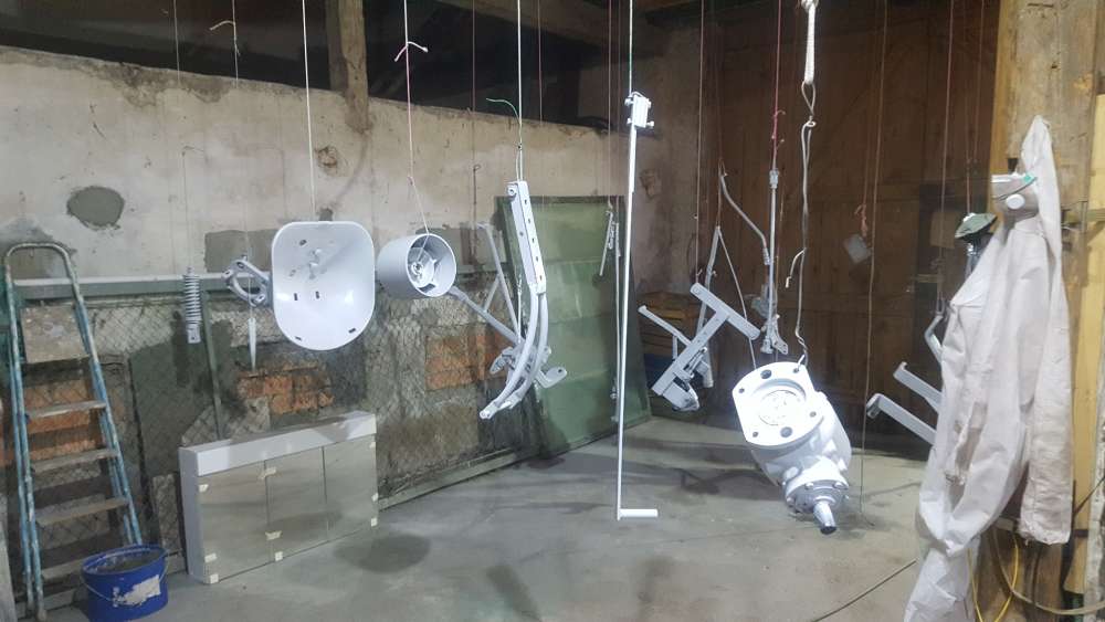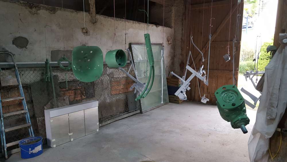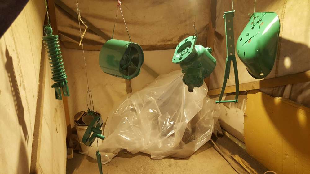 Nach kurzer Zeit war die Farbe gut angetrocknet, sodass die grünen Teile in einen anderen Raum umgehängt werden konnten, sodass bei den weiteren Lackier-Durchgängen mit roter Farbe kein Farbnebel die bereits grün lackierten Teile bedeckt.