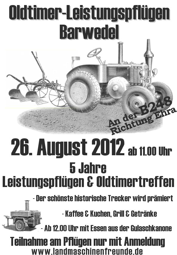 Am 26.08.2012 findet in Barwedel (Niedersachsen bei Wolfsburg) unser 5. Oldtimer-Traktor Leistungspflügen mit Schleppertreffen statt. Los geht es um 11 Uhr.