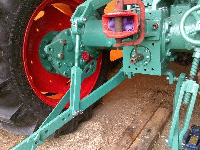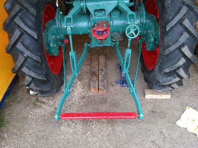 der schlepper hatte von anfang an keine hydraulik, sondern nur die ackerschiene hinten dran. ich wollte dem schlepper aber eine hydraulik verpassen, damit man auch anspruchsvollere arbeiten verrichten kann. die teile habe ich von verschiedenen quellen organisieren müssen, vor allem "peter gabele" und "karl-heinz rigling" haben mir da ungeheuerlich weitergeholfen. die hydraulikpumpe lässt sich einfach montieren, da das zahnrad dafür schon im schlepper vorhanden ist. der hydraulikzylinder musste komplett neu abgedichtet werden und eine neue hydraulikleitung aus flexiblem schlauch wurde hergestellt. der hebel, der die kraft vom zylinder auf die welle überträgt, wurde extra neu angefertigt und ist ein teil, das man gebraucht kaum mehr auftreiben kann, da die originalen hebel aus guss meistens irgendwann gebrochen sind. die spindeln zwischen den armen an der welle und den unterlenkern sind meistens auch in mitleidenschaft gezogen und wurden gerichtet und aufgeschweisst. die unterlenker scheinen von einem anderen schleppertyp zu sein, passen aber von der geometrie an den D160H. der vordere befestigungspunkt der unterlenker wurde auch komplett neu hergestellt aus neuem material, da ein originalteil nicht aufzutreiben war. der vordere deckel, an dem der hydraulikzylinder sich abstützt, wurde von einem spenderfahrzeug abmontiert und übernommen. diverse bolzen wurden komplett neu hergestellt aus nicht rostendem werkzeugstahl. insgesamt dauerte es drei monate, bis alle teile zusammengetragen waren, montiert war die hydraulik in viel kürzerer zeit.