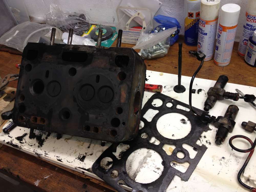 So, der Kopf ist ab. Zylinder und Laufbuchsen sehen gut aus. Bei dem verrußten Ventil ist die Schaftdichtung nicht in Ordnung und muss gemacht werden. Ich lass dann gleich die Einspritzdüsen mit überprüfen und den Ventilsitz neu schleifen.