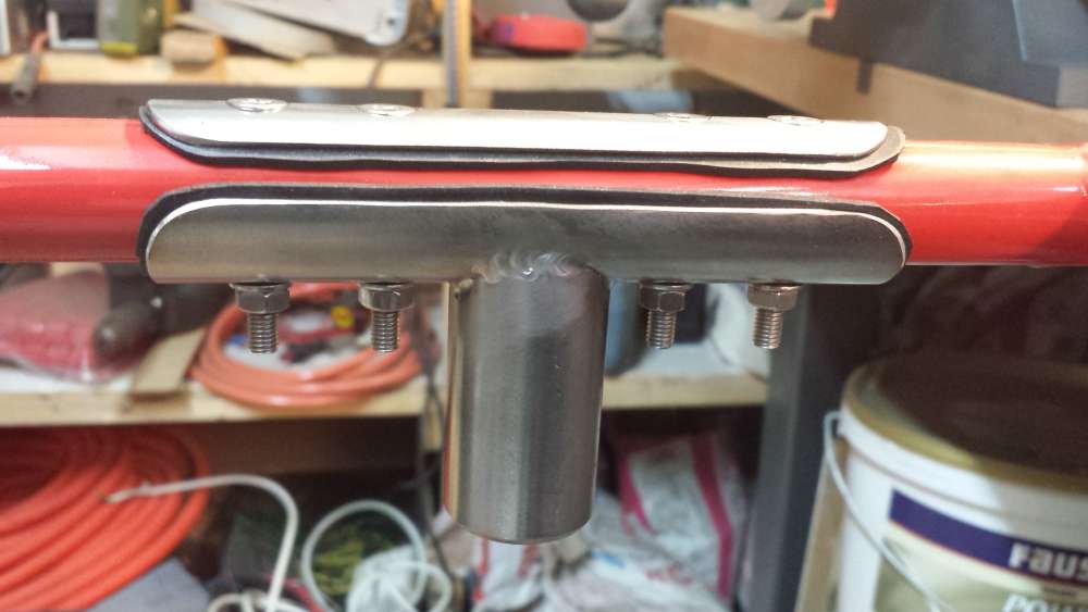 Gefertigt ist das Ganze aus einem Rohr mit Unterlagen aus 2mm Gummimatte, um es mechanisch zu entkoppeln, damit es nicht dröhnt. Die unteren Aufnahmen brauchen nurnoch die Standrohre. Dann noch die Stützrohre biegen. Am Ende wird es natürlich noch lackiert.