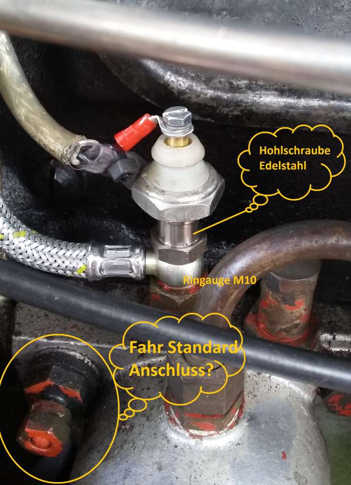 Normalerweise ist dort bereits eine Hohlschraube mit zusätzlicher Anschlussmöglichkeit für eine 6mm Leitung für den Öldruckmesser, welche aber mit einer Kugel und Überwurfmutter verschlossen ist.
