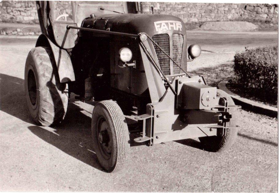 Auf einem Bild mit dem Fahr D28, Baujahr ca. 1949 sieht man die Anbauplatte mit mechanischer Hebe- und Senkvorrichtung. Im Fahrerhaus war das Handrad mit dem man durch drehen über die Welle und dem Kettentrieb den angebauten Schneepflug heben und senken konnte.
