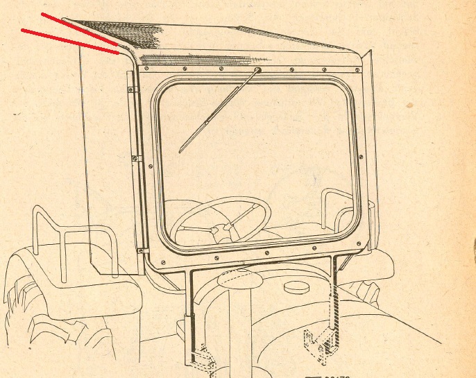 Wie schon angedeutet, handelt es sich um eine optische Täuschung mit der sich der Zeichner selbst reingelegt hat. Kurz gesagt hat sich der Zeichner beim Durchziehen von 2 Linien richtig vertan. Es geht um die linke Seitenscheibe(im Bild links)und darum, wie und woran sie befestigt ist. Die Scheibe wird durch einen schmalen Streifen und 3 Schellen am Grundrahmen des Verdecks befestigt. Nur irgendwie scheint da was nicht zu stimmen.