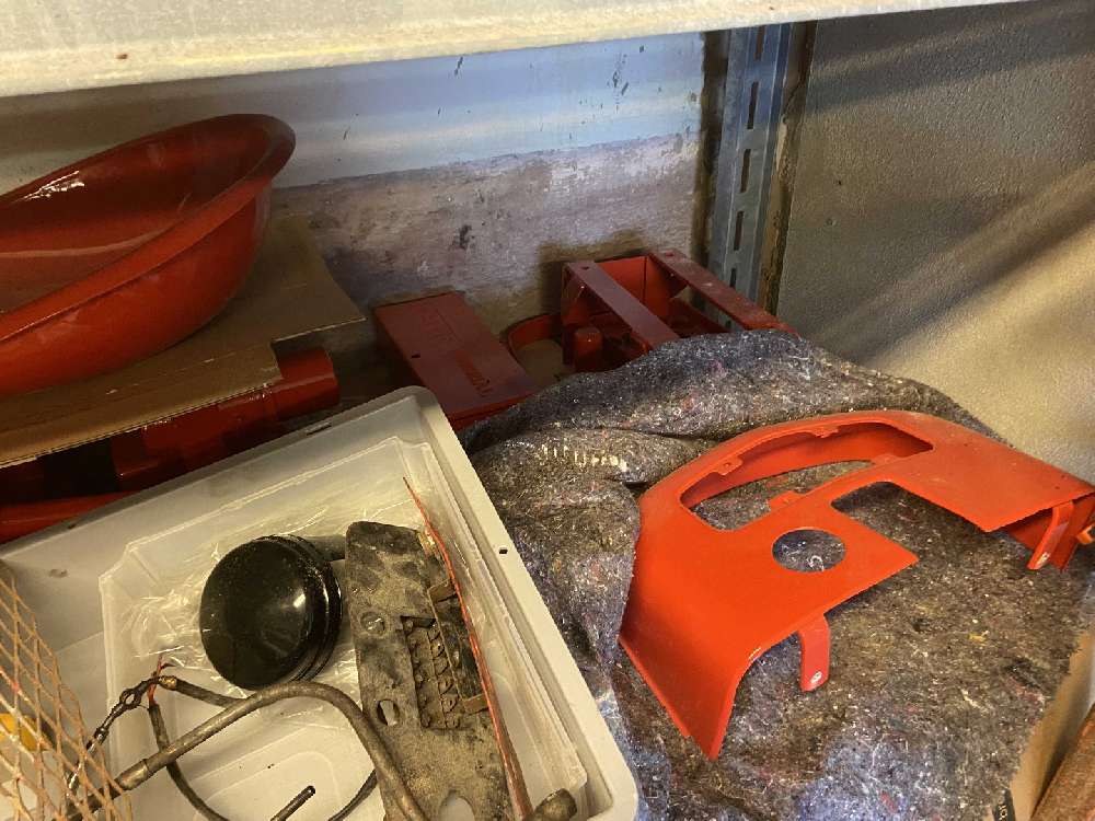 zwei Achstrichter, Anlasser, 2 Motorhauben (zustand naja), Batteriehalter, Sitz, Cockpit, Mähwerk uvm.