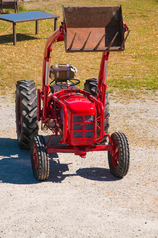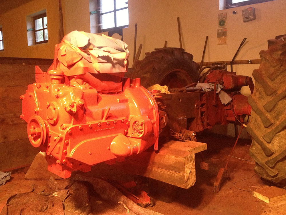 Zur Feier wurde die Motorhaube ausgebeult, mit viel Geduld in die ursprüngliche Form geklopft und wo es ganz fehlte wurde gespachtelt. In insgesamt 7 Durchgängen und immer wieder Lackiert. Der Frontlader wurde entrostet & lackiert.