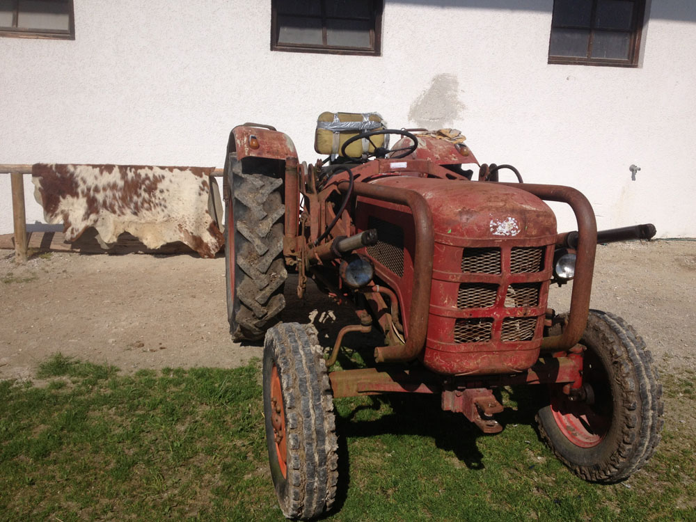 Irgendwann holten wir uns noch ein Jungpferd dazu und auf dem Zuchtbetrieb stand ein alter Fahr D133N in der Gegend herum. Optisch da schon eine Katastrophe, aber mit Frontlader und nachdem die Dame des Hauses ein neues "Spielzeug" bekam wurde eher im Spass über den Traktor verhandelt. Aus Spass wurde Ernst und mir schon ein bisschen mulmig als sich der Fahr zuhause nur äusserst widerwillig von der Ladefläche bewegen liess und eine ganze Weile recht traurig im Hof stand.